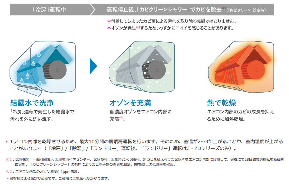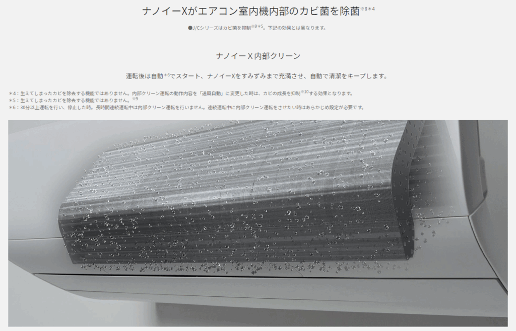 冷房運転開始後、ナノイーが自動で働き、送風運転をして菌を殺しながら乾燥させる