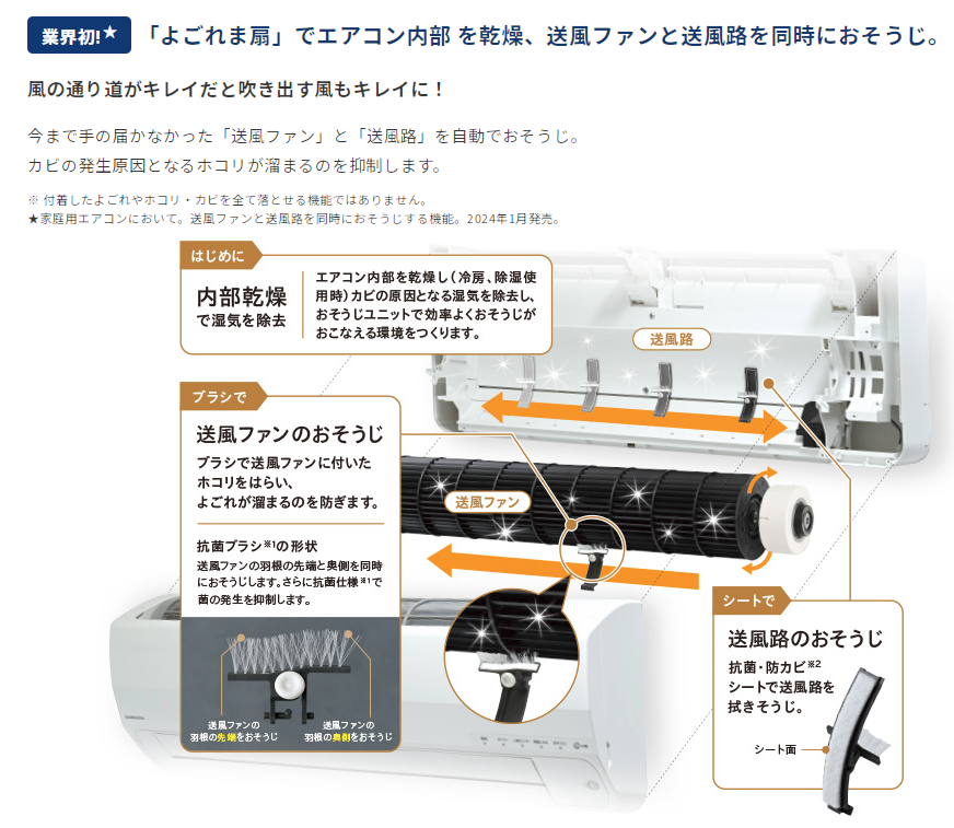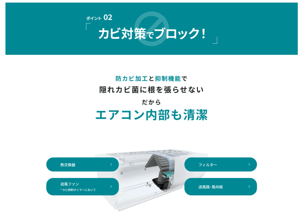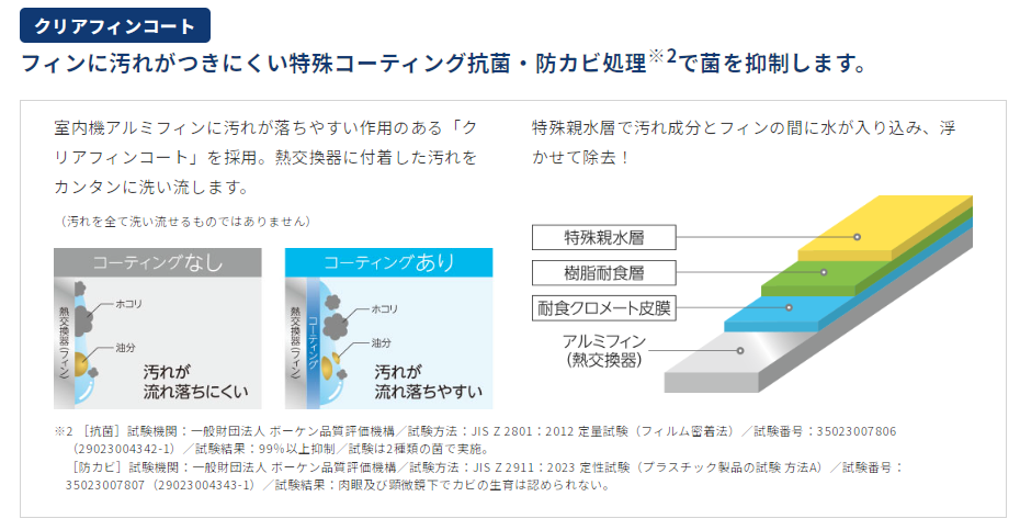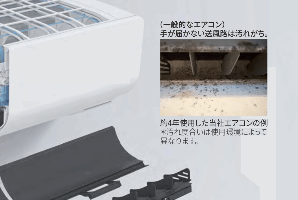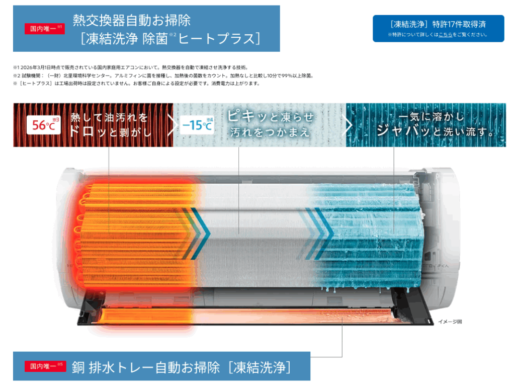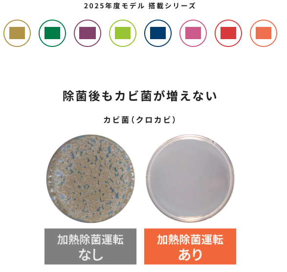 ゼネラルだけが、フィン(乾いていたら冷房運転をしてフィンを濡らすことも)を55度に熱し、黒カビを死滅させる。