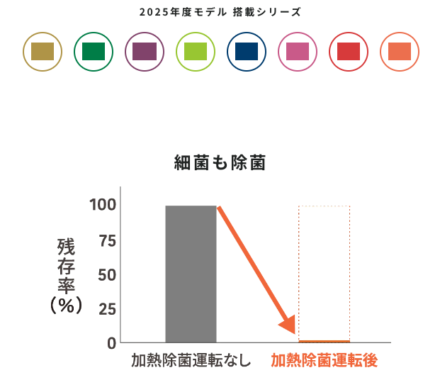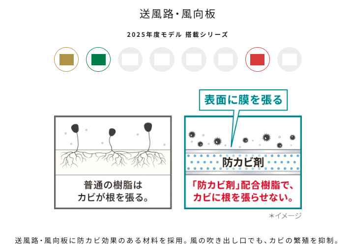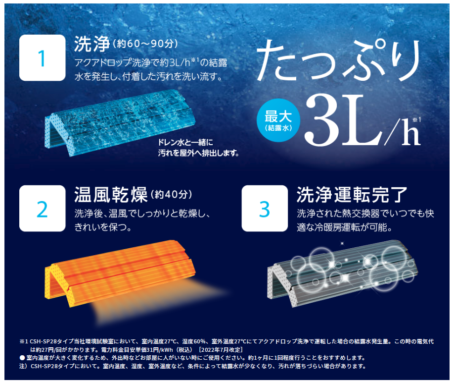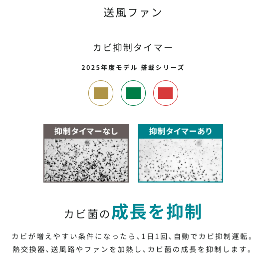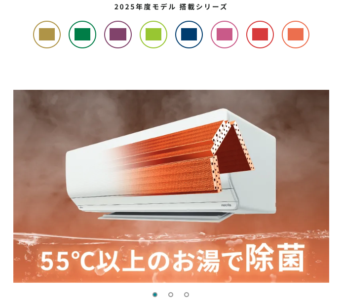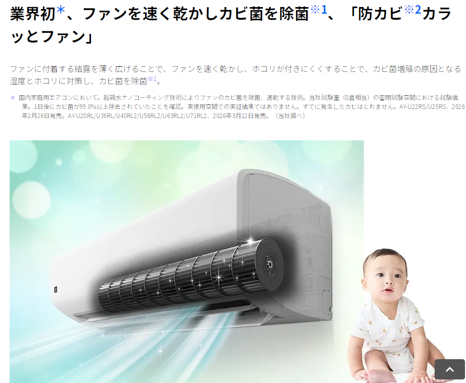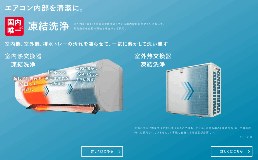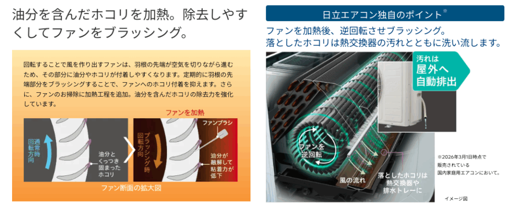 ゼネラルだけが、フィン(乾いていたら冷房運転をしてフィンを濡らすことも)を55度に熱し、黒カビを死滅させる。
