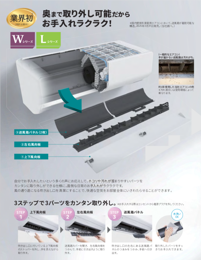 Lシリーズなら、お掃除機無し、取り外して洗えるができます