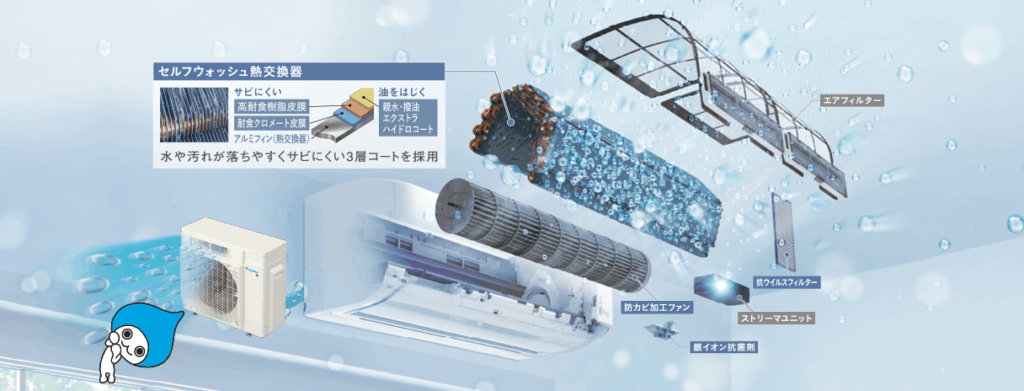 ダイキンは、熱交換器と気流通路にストリーマが働きます