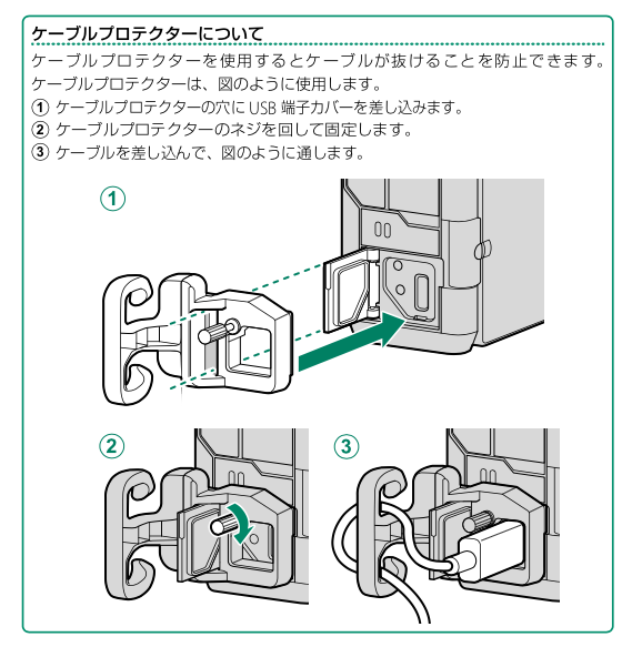 FUJIFILMのGFXシリーズやX-Hシリーズには、標準でケーブルプロテクターが用意されている