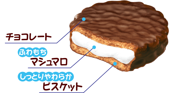 ビスケット生地の間にマシュマロが挟まっていて、それをチョコでコーティング