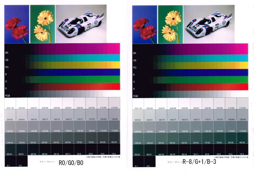 左が何もしない写真、右が、使用するモニターに写真画像を映しながら、出力したプリントに近づけたものです