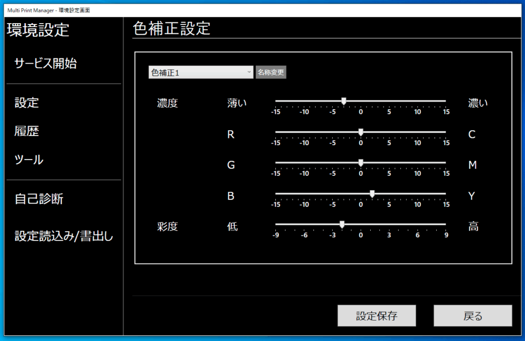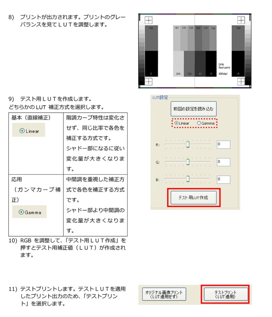 MPM側の色補正1(プリント用)、色補正2(ID-300C)用の数値をフラットにしてテストプリント
