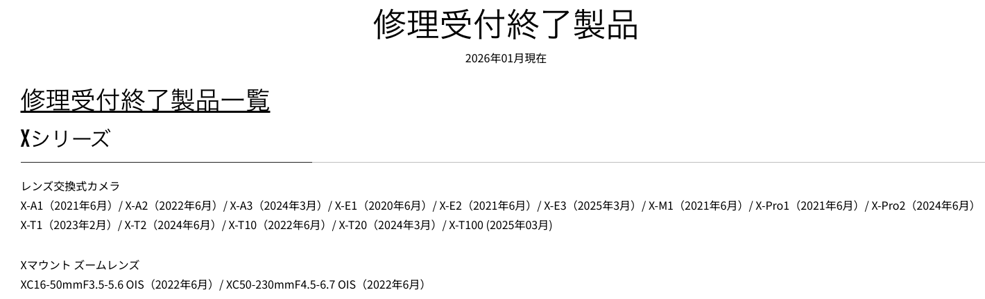 修理受付終了製品 2026年01月現在 修理受付終了製品一覧 Xシリーズ レンズ交換式カメラ X-A1(2021年6月)/ X-A2(2022年6月)/ X-A3(2024年3月)/ X-E1(2020年6月)/ X-E2(2021年6月)...